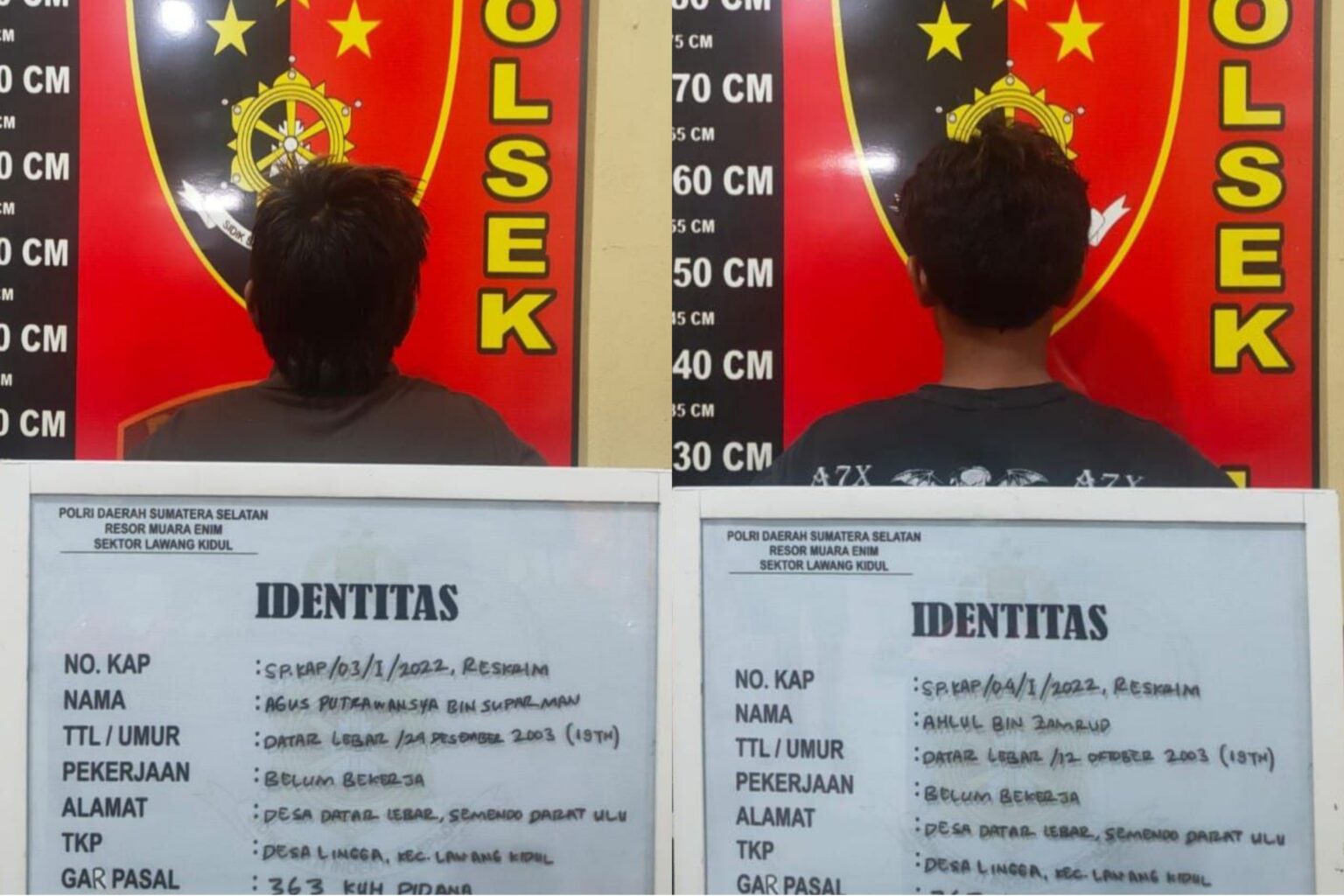Kapolres Muara Enim AKBP Andi Supriadi melalui Plh Kapolsek Lawang Kidul Iptu Yulisman membenarkan adanya laporan masuk terkait kasus pencurian dengan pemberatan (Curat). Ia mengatakan dua orang pelaku telah berhasil diamankan oleh pihaknya.