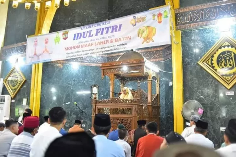 Muara Beliti, Bupati Musi Rawas Hj Ratna Machmud dan Wakil Bupati (Wabup) Hj Suwarti melaksanakan Shalat Idul Fitri 1444 H di Masjid Agung Darussalam Muara Beliti, Sabtu (22/4/2023).