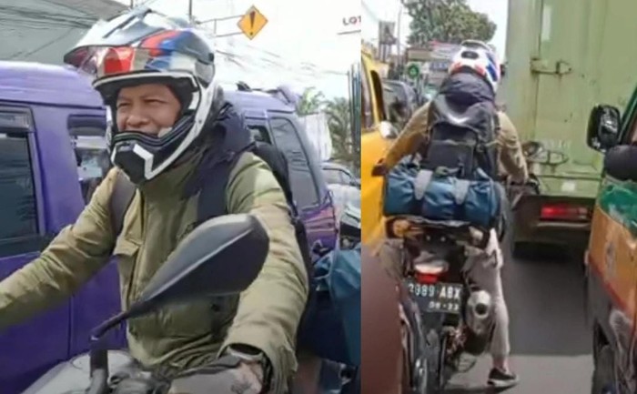 Melalui video tersebut, Ariel terlihat membelah kemacetan jalan yang didominasi kendaraan roda empat. Dia sesekali membuka visor atau kaca helmnya untuk mengusir pengap akibat panas.
