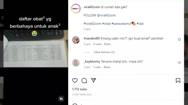 Berkaitan dengan itu, viral di media sosial (Medsos) Instagram daftar yang diduga adalah nama-nama obat yang berbahaya untuk anak. Hal itu diungkapkan dari keterangan yang ada di video.
