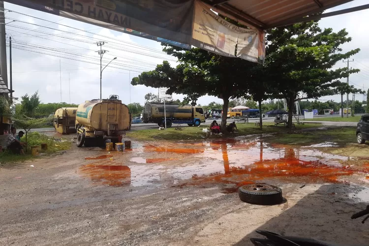Sebuah truk muatan CPO atau minyak kelapa sawit terbalik dan muatannya sebanyak 8 ton tumpah ruah ke sisi jalan.