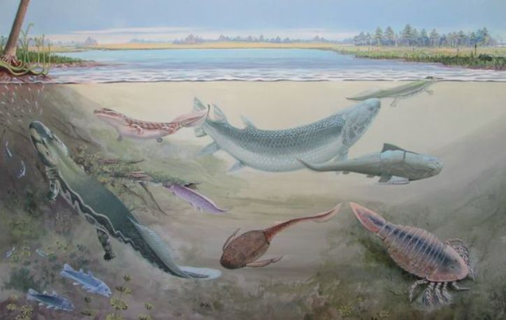 Makhluk ini adalah Hyneria udlezinye, salah satu predator dari kelompok tristochoterids, kerabat tetrapoda, empat hewan berkaki pertama di darat.