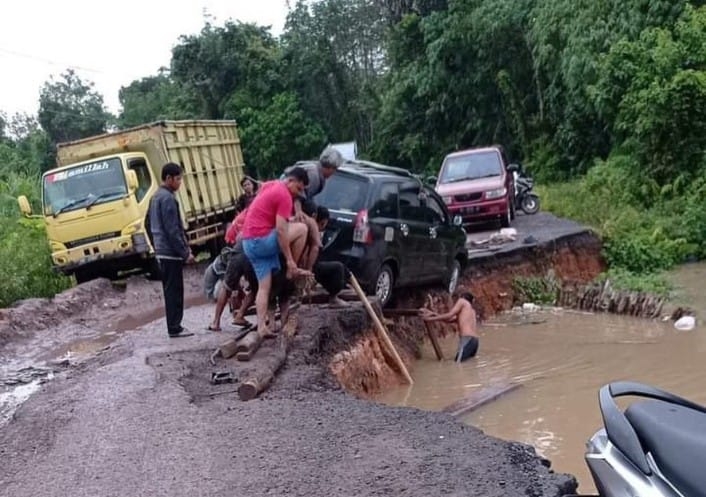 Beruntung, mobil tersebut hanya terperosok dan tidak terjun ke sungai yang tepat berada di sisi jalan. Karena, longsoran ini telah memakan setengah dari badan jalan.