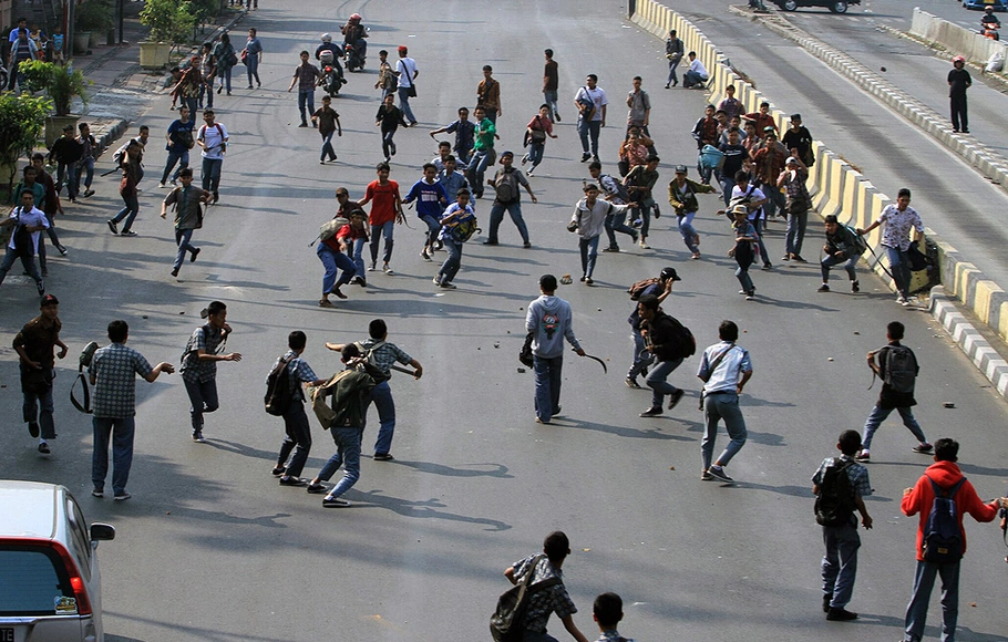 Ratusan remaja yang masih mengenakan seragam sekolah dengan dibalut jaket terlibat saling serang menggunakan senjata tajam di ruas Jalan Tlajung Udik, Kecamatan Gunungputri menjelang tengah malam ini.