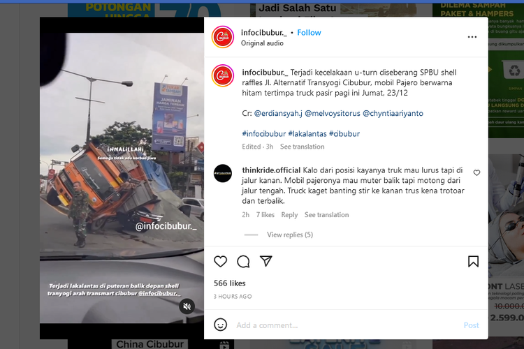 Kecelakaan terjadi di putar balik di seberang SPBU Shell Raffles Jl. Alternatif Transyogi Cibubur. Pada video singkat tersebut, tampak truk berisi pasir hampir terguling dan menimpa Pajero yang ada di sebelahnya.