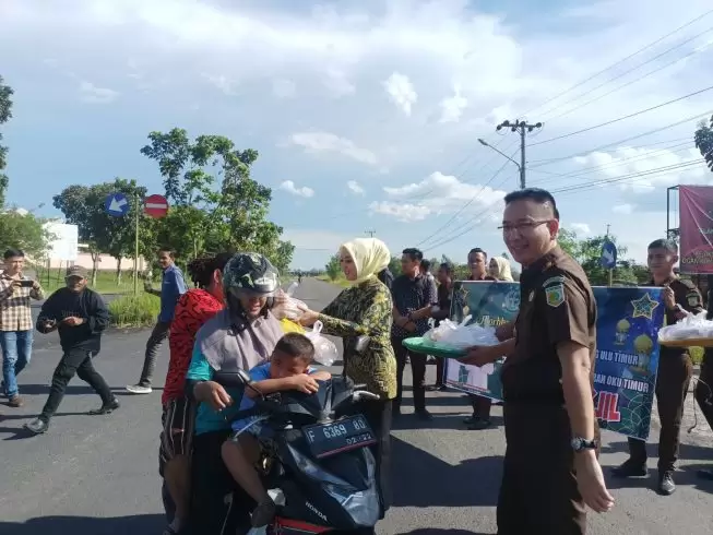 Sebanyak 150 takjil dibagikan ke sejumlah pengendara yang melintas di depan kantor Kejaksaan Negeri OKU Timur.