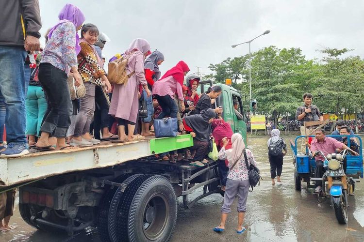 Akibatnya, ratusan pekerja dipulangkan lebih awal yakni pada pukul 10.00 WIB, Jumat (2/12/2022). Salah seorang pegawai PT Pinakel Apparel, Ida, mengaku harus menerjang rob setinggi lututnya saat berangkat bekerja pukul 06.15 WIB. Ia terlihat memakai sandal dan menyingsingkan celananya saat diwawancarai Kompas.com.