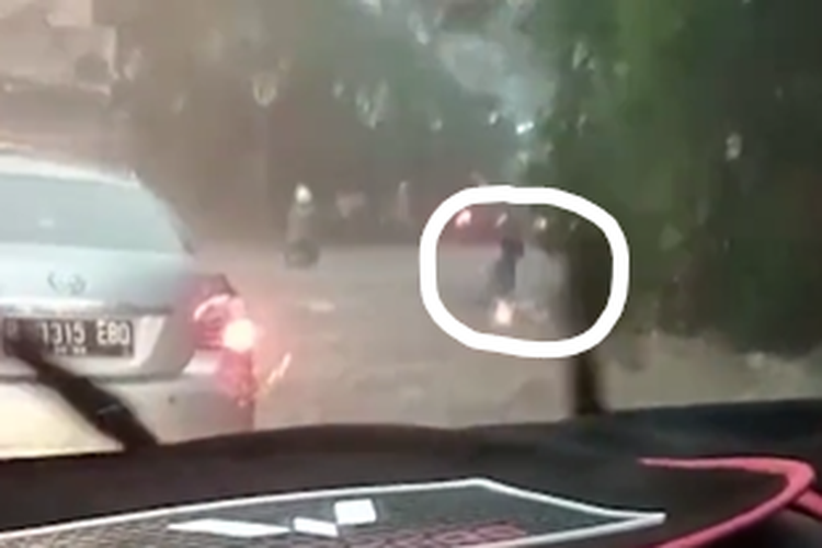 Di sisi kanan jalan, korban yang mengendarai motor tengah melaju pelan, terseret arus banjir dan sempat bertahan.