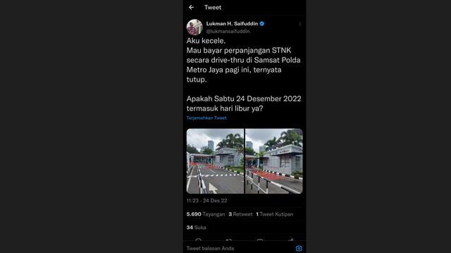 “Aku kecele. Mau bayar perpanjangan STNK secara drive-tru di Samsat Polda Metro Kaya pagi ini ternyata tutup,” tulis @lukmansaifuddin seperti dikutip, Minggu (25/12/2022).