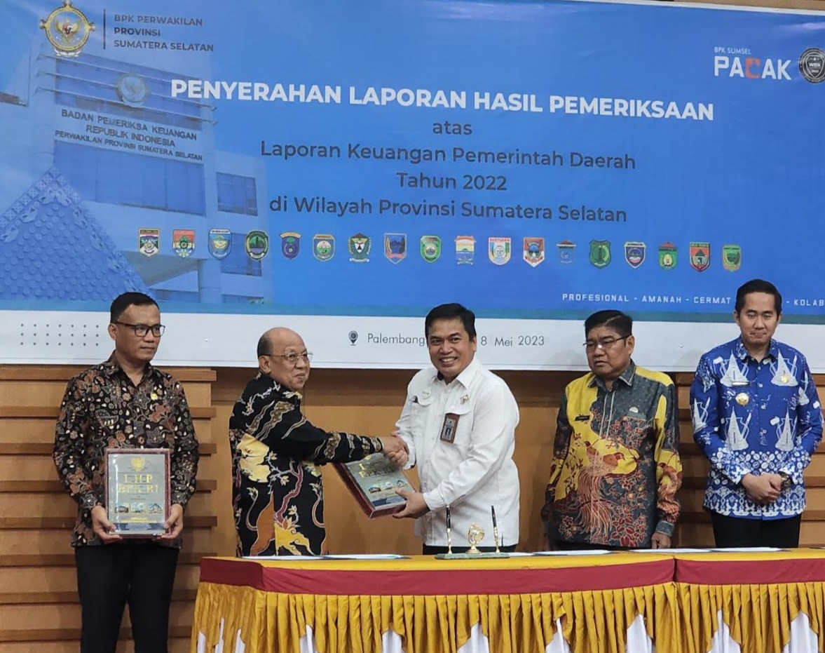 LAHAT, SUMEKSCO – Pemerintah Kabupaten (Pemkab) Lahat berhasil meraih penghargaan bidang keuangan, dengan predikat Wajar Tanpa Pengecualian (WTP) yang ke 9 secara berturut-turut, Senin 8 Mei 2023. Penghargaan diterima langsung Bupati Lahat Cik Ujang SH melalui Wakil Bupati (Wabup), H Haryanto SE MM MBA didampingi Ketua Dewan Perwakilan Rakyat Daerah (DPRD), Fitrizal Homizi ST Msi MM dan Kepala Badan Pengelolaan Keuangan dan Aset Daerah (BPKAD), M Ghufran D SE MM, di Gedung Badan Pemeriksaan Keuangan (BPK) Perwakilan Provinsi Sumatera Selatan (Sumsel).