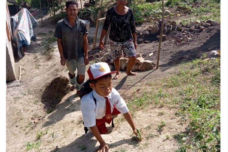 Meski harus dengan merangkak, Rivaldus tetap bersemangat menempuh jarak 1.800 meter menuju ke Sekolah Dasar Negeri (SDN) Sae Desa Komba.