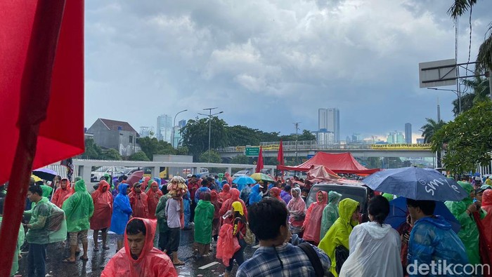 Pantauan detikcom di Jalan Gatot Subroto, Jakarta, Selasa (28/2/2023), massa terlihat menggunakan jas hujan dan berkumpul di tengah jalan. Ada empat mobil komando yang berada di lokasi.