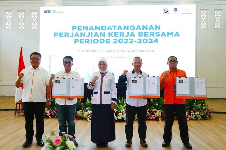 Menteri Ketenagakerjaan (Menaker), Ida Fauziyah menyaksikan Penandatanganan Perjanjian Kerja Bersama (PKB) Manajemen PT Pos Indonesia dengan Serikat Pekerja Pos Indonesia (SPPI) dan Serikat Pekerja Indonesia Kuat Bermartabat (SPPI–KB), di Jakarta, Senin (12/12/2022).