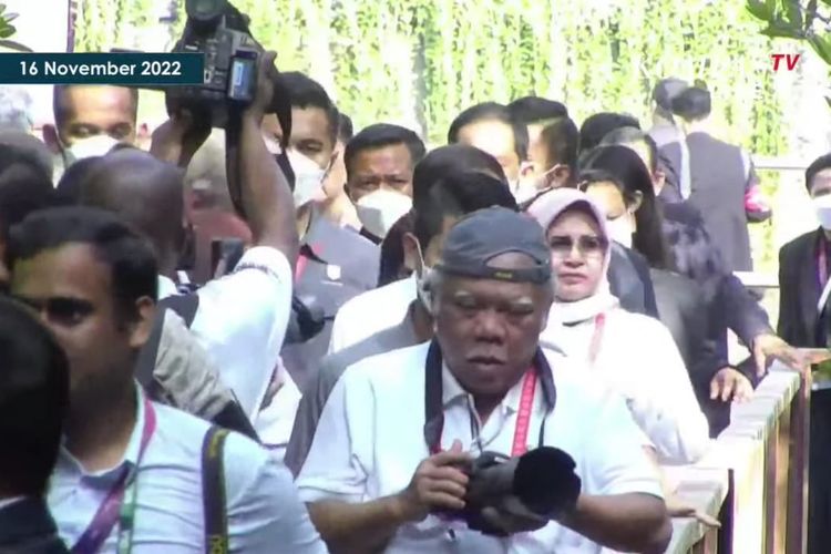 Dengan kostum kaus putih berkerah lengan panjang dan logo G20 di dada kiri, Presiden Joko Widodo mengajak pemimpin delegasi lainnya untuk berkeliling dan sesekali menunjukkan bibit mangrove.