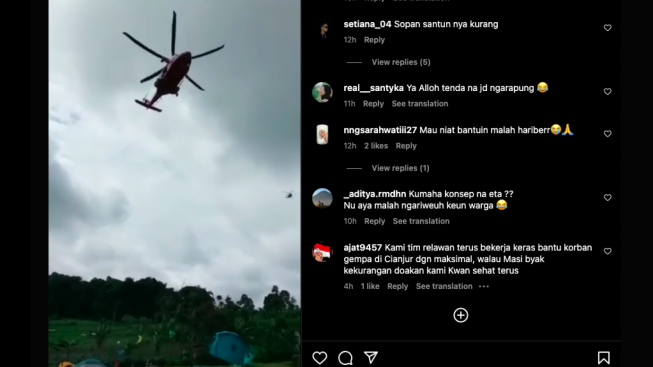 Video tersebut pun menjadi viral. Dilihat dari akun Instagram @infocianjur, meunggah video sebuah helicopter terbang rendah dibawah posko pengungsian warga.