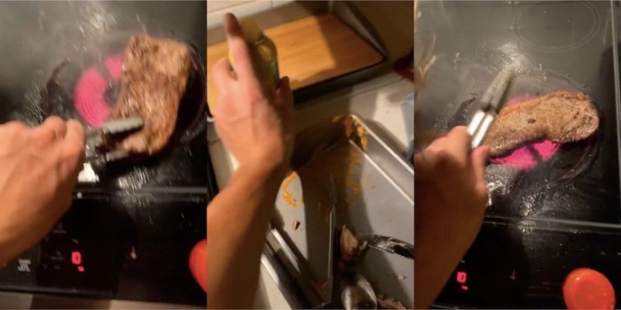 Tampilan daging steak yang dimasak langsung di atas kompor kaca. Luarnya memang matang, tetapi belum tentu dalamnya juga matang. Foto: TikTok @71199p