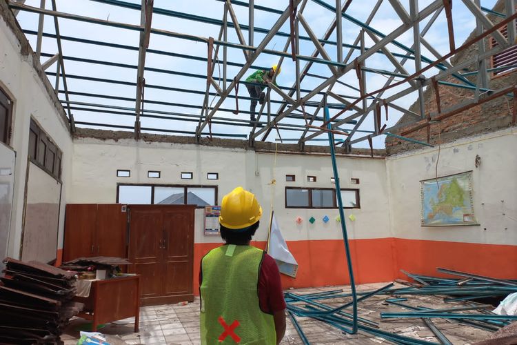 Berdasarkan pantauan Kompas.com di lokasi, setidaknya ada lima pekerja yang tengah memperbaiki kerangka atap di dua kelas tersebut.
