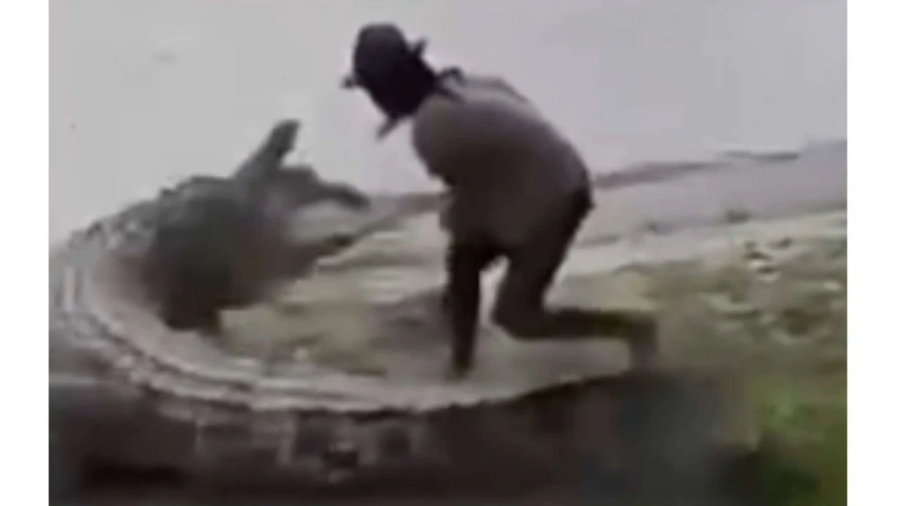 Sesaat kemudian, buaya besar tersebut tampak bereaksi dan memutarkan kepala dan tubuhnya ke arah sang pria sambil membuka mulutnya. Pria yang melakukan aksi nekat itu benar-benar nyaris diterkam. Untungnya, sang pria masih dapat selamat dari terkaman buaya karena dengan sigap langsung menjauhkan diri. Namun, pria tersebut sempat terjatuh karena kaget dengan buaya yang tiba-tiba bergerak.