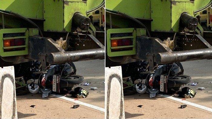 Posisi motor persis berada di bawah bagian belakang truk tangki warna hijau nomor polisi BG 8425 NQ.