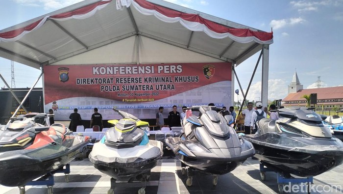 Pantauan detikSumut, Rabu (30/11/2022), tampak sejumlah jetski telah disusun rapi di lapangan parkir belakang Polda Sumut. Dalam label barang bukti yang dilihat, tertulis tempat penyitaan di Desa Parmonangan, Kecamatan Simanindo, Kabupaten Samosir dengan jenis barang berupa jetski.