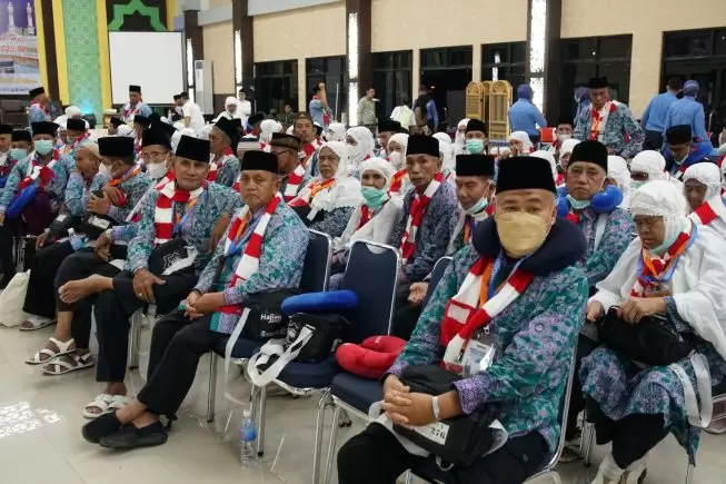 Jamaah Kloter 5 dilepas Kakankemenag OKU Timur H. Ishak Putih di Aula Asrama Haji Palembang, Rabu (31/5) malam.