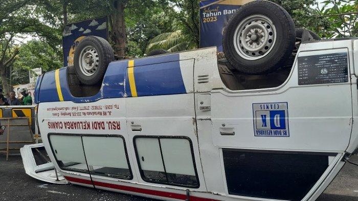 Mobil ambulans milik RS Dadi Keluarga, yang membawa bayi usia 3 hari, terbalik setelah tertabrak truk boks di Ciamis, Jawa Barat. Beruntung seluruh penumpang selamat dari kejadian tersebut.