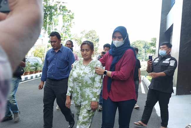 Tersangka Lina tampak pucat saat digiring petugas dan hanya mengenakan baju tidur bercorak abstark dan tidak mengenakan baju tahanan Polda Sumsel.