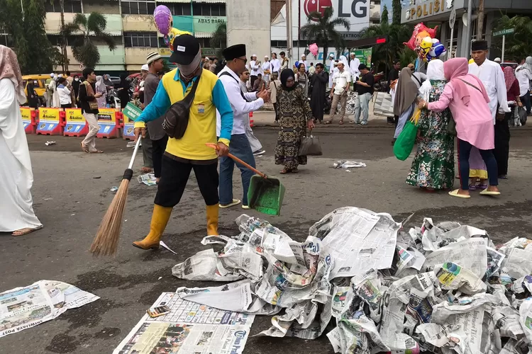Pantauan detiksumsel.com banyak koran bekas berhamburan di jalan Sudirman, Faqih Jalaluddin, jembatan Ampera dan jalan Merdeka berubah menjadi lautan koran bekas alas jamaah usai.