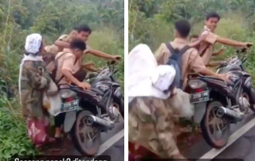 Dalam video tersebut, tampak sekelompok pelajar mengendarai sepeda motor dan berhenti di hadapan nenek yang tengah berjalan sendirian.