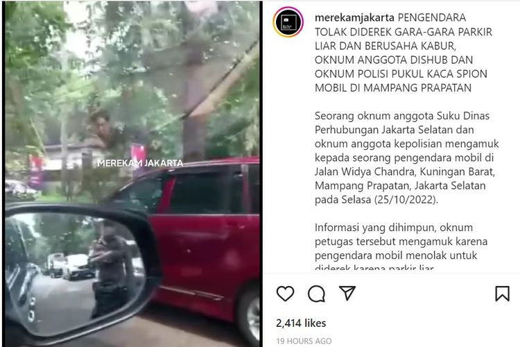 Petugas Dinas Perhubungan dan polisi diduga merusak spion mobil yang parkir sembarangan di Jalan Widya Chandra, Kebayoran Baru, Jakarta Selatan. Aksi perusakan spion yang dilakukan oleh dua orang anggota itu direkam dan videonya beredar luas di media sosial. Salah satunya diunggah di akun Instagram @merekamjakarta. Dalam video tersebut terlihat seorang anggota Dishub mengetuk kaca mobil dengan maksud meminta sang pengemudi membuka kaca dan keluar. Namun, tindakan tersebut tampaknya tak digubris sampai akhirnya seorang polisi berbaret biru diduga dari jajaran Profesi dan Pengamanan (Propam) memukul kaca spion mobil tersebut.