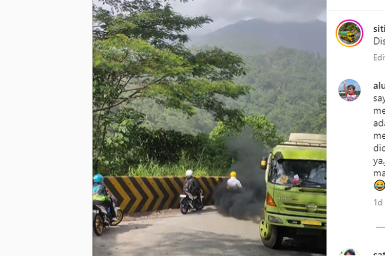 Sontak, begitu ada sebuah truk dari arah bawah mengarah ke atas, para pengendara motor tersebut terkena semburan asap hitam dari knalpot truk.