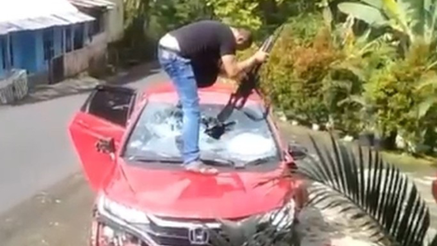 ”Ngebut kowe (kamu ngebut),” kata warga di video tersebut. Video kemudian menunjukkan aksi polisi itu naik ke atas mobil Honda Jazz merah. Dia tampak memukuli kaca mobil hingga pecah dengan benda mirip senapan laras panjang.