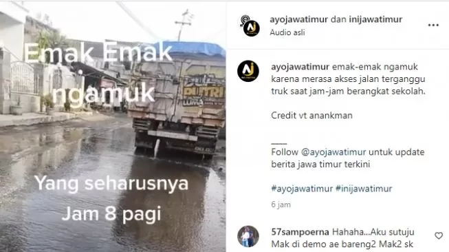 Dalam video yang diunggah oleh akun instagram @ayojawatimur, terdengar seorang emak-emak tengah mengamuk karena kesal banyak truk-truk yang menghalangi jalan. Pasalnya saat itu merupakan jam berangkat sekolah.