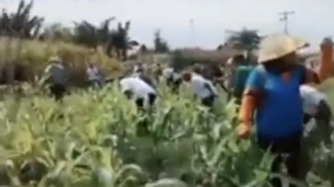 Lewat video yang dibagikan oleh akun Twitter @regar_0p0sisi, terlihat seorang petani sambil mengendong anaknya serta sang istri yang berada disampingnya tampak menangis histeris pasrah melihat tanaman mereka dihancurkan.
