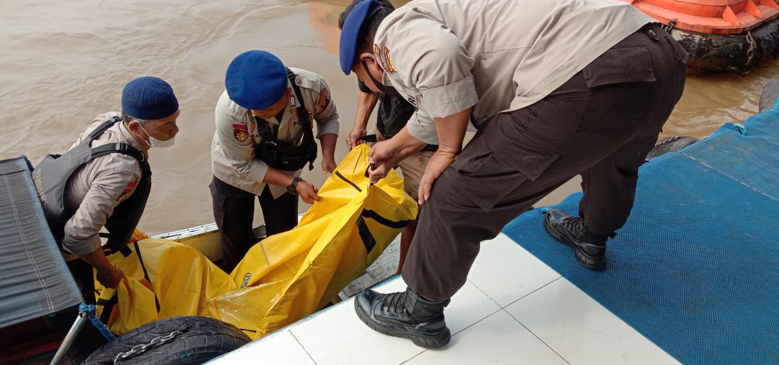 Mayat korban langsung dibawa ke Dermaga Mako Sat Polairud Polrestabes Palembang dengan menggunakan Speedboat.