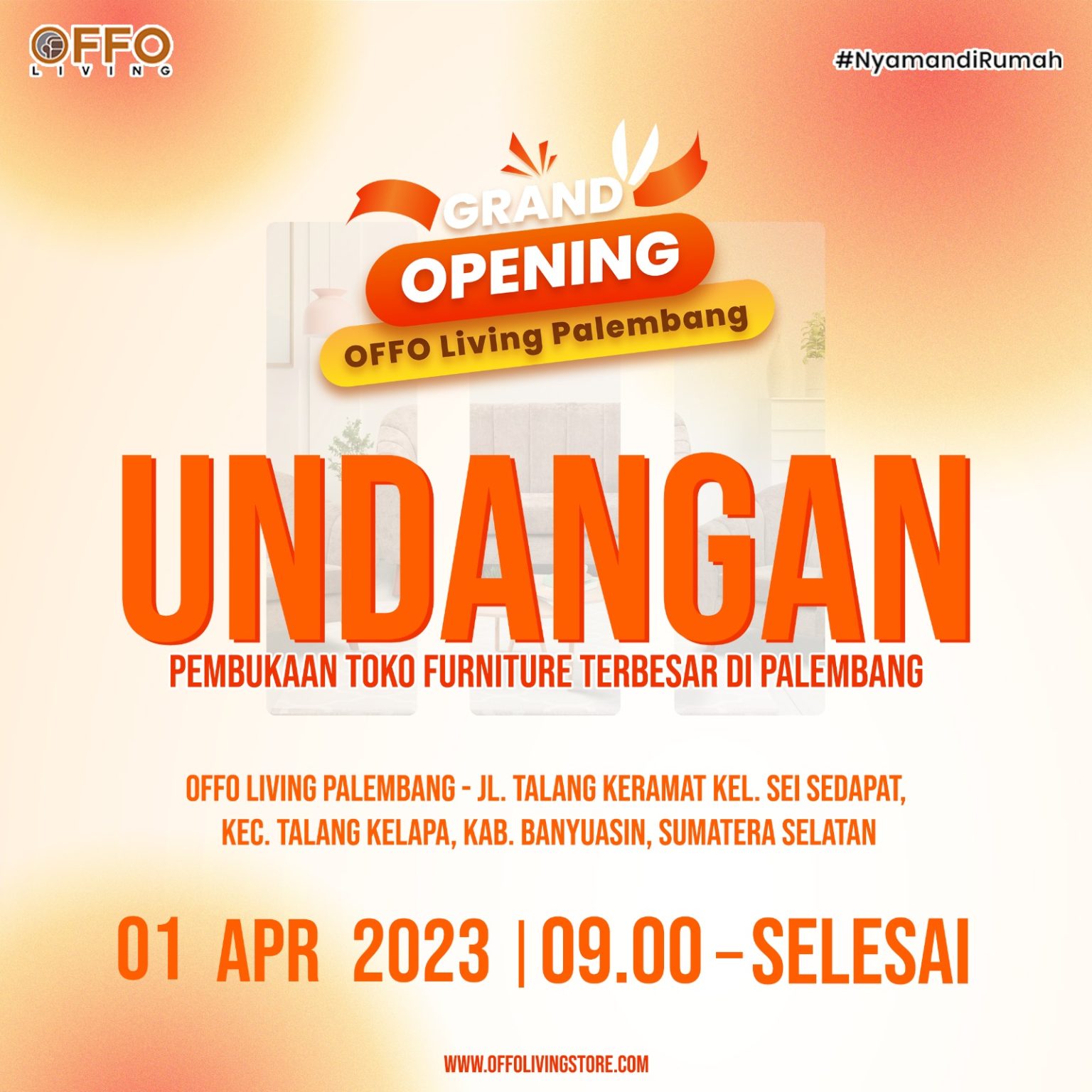 Palembang, sumselupdate.com – Kabar gembira untuk masyarakat Palembang khususnya yang berlokasi di daerah Banyuasin, Sumatera Selatan. Offo Living akan meresmikan store terbaru di Jalan Talang Keramat RT. 05/RW. 02, Kelurahan SEI Sedapat, Kecamatan Talang Kelapa, Banyuasinn, Sabtu (1/4/2023).