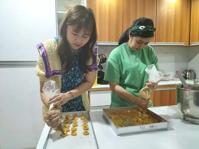 “Pada dasarnya kami berdua hobby bikin kue sejak sebelum menikah, dan dulu awalnya dari mulut ke mulut dan via instagram, Alhamdulillah dengan banyaknya peminat kami sudah memiliki outlet sendiri sejak sebelum puasa tadi,” kata Tivonny dan Tiara disela pembuatan kue.