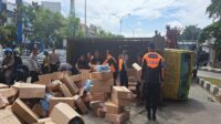 Kaget Mobil Setop Mendadak, Truk Terguling di Simpang Polda Sumsel, Buku Berhamburan
