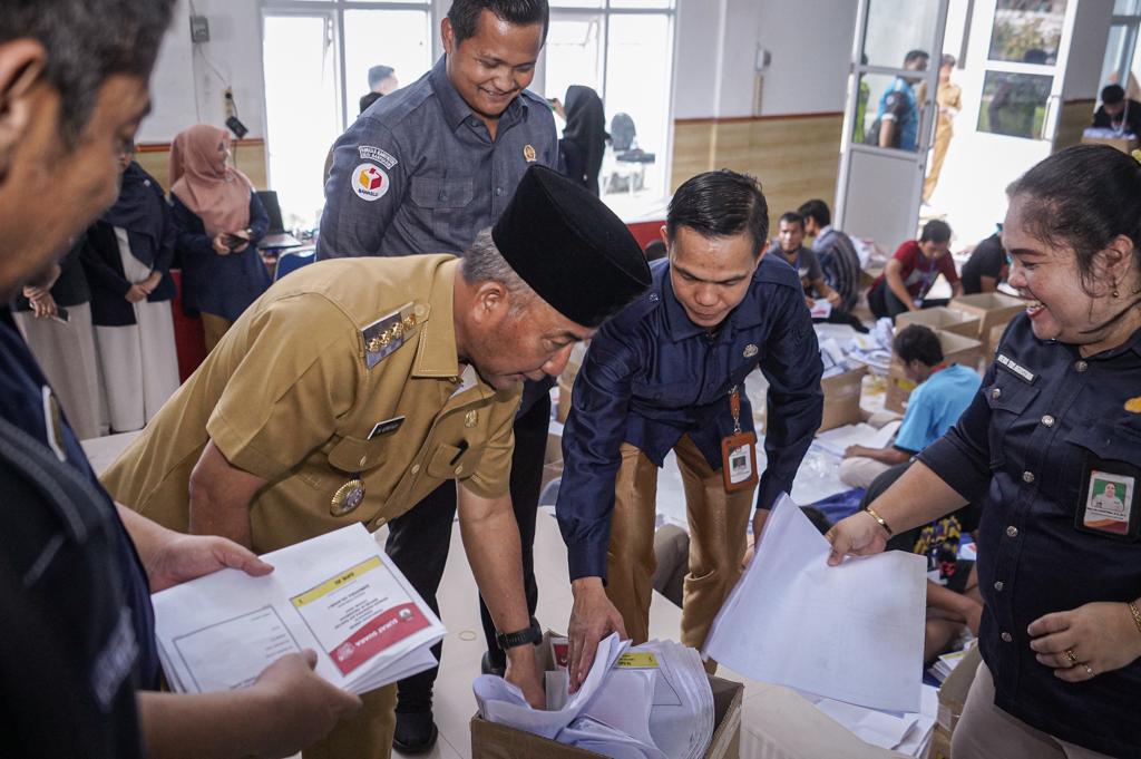 Setelah melakukan pengecekan proses sortir dan pelipatan surat suara, Pj Bupati Muba juga mengecek gudang tempat penyimpanan kotak suara Pemilu 2024.