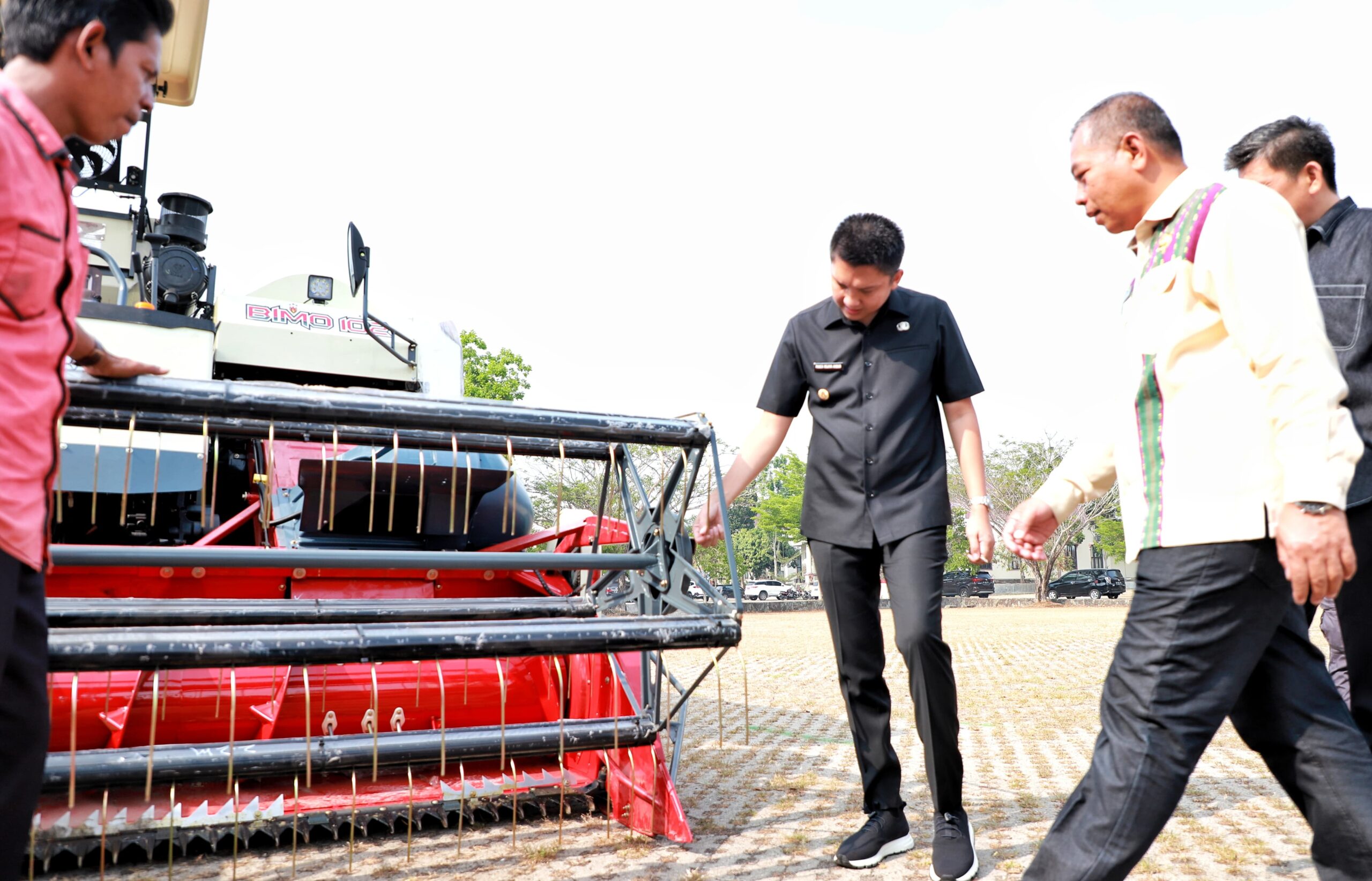 Sebelum menyerahkan kunci alsintan kepada kelompok tani yang hadir pada acara penyerahan yang dipusatkan di Halaman Upacara KPT Tanjung Senai, Panca terlebih dahulu menjajal peralatan tersebut.