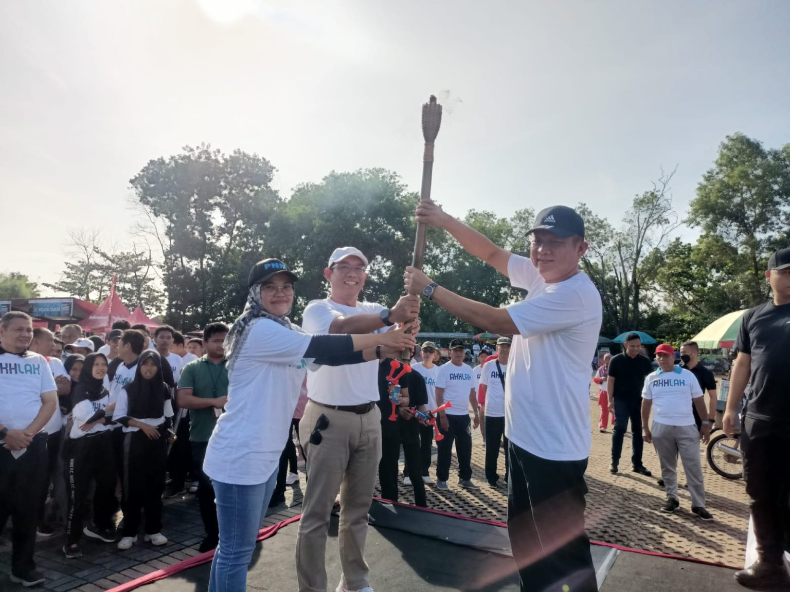 Bersamaan dengan penyerahan obor secara simbolis, tanda dimulainya jalan sehat bersama yang digelar oleh BUMN. Tampak ribuan peserta dari berbagai usia dan kalangan sudah memadati lapangan KONI Martapura.