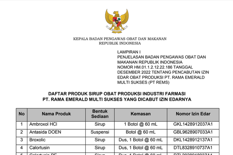Badan Pengawas Obat dan Makanan (BPOM) mencabut izin edar 32 obat produksi PT Rama Emerald Multi Sukses (PT REMS) yang berlokasi di Gresik, Jawa Timur.