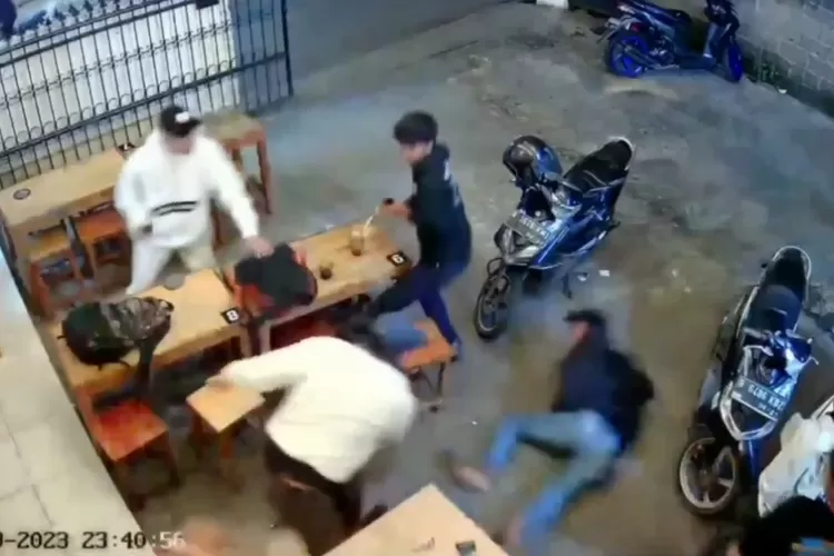 Orang yang diserang sempat terjatuh ke lantai lalu bangkit kembali.