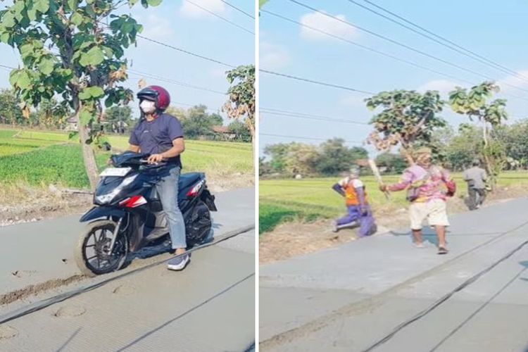Melihat ada pengendara yang nekat menerobos jalan cor, para pekerja jalan di lokasi langsing meneriaki pemotor itu.