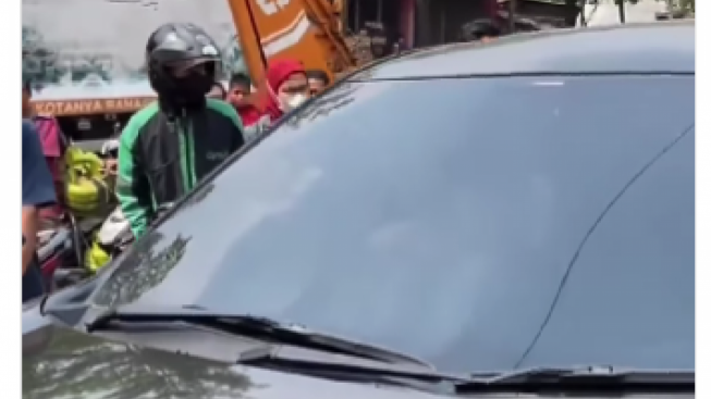 Di video terlihat satu mobil hitam itu disetop warga, sementara ada seorang laki-laki berhelm yang diduga ojol berada dalam mobil bersama pelaku.