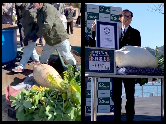 Video penemuan lobak itu bahkan diunggah di akun Instagram resmi Guinness World Record. Beratnya tercatat 45.865 kg! Untuk diameternya 113 cm dan panjang akarnya 80 cm.