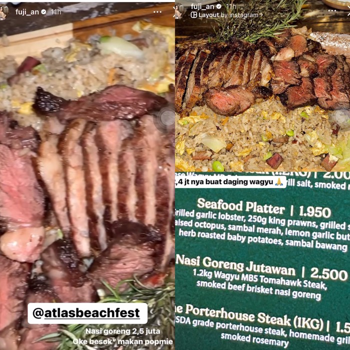 Dalam unggahan lanjutan, Fuji juga menunjukkan buku menu nasi goreng tersebut. Hidangan ini dinamai Nasi Goreng Jutawan yang merupakan nasi goreng berisi smoked beef brisket dengan 1,2 kilogram Wagyu MB5 Tomahawk Steak.