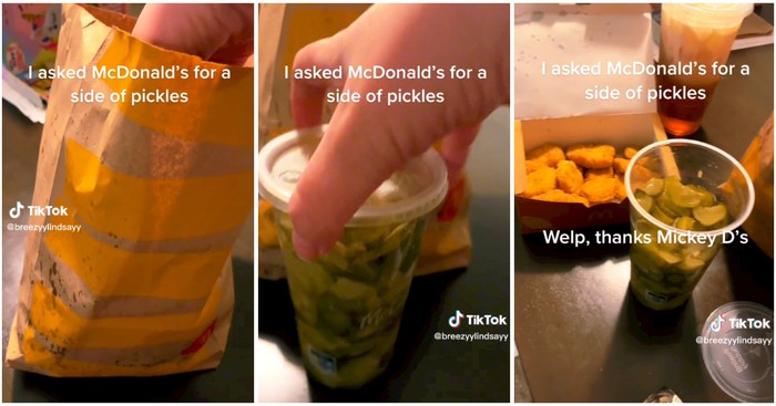 Ingin membuat burgernya lebih segar, pelanggan ini meminta tambahan acar timun atau gherkin yang lebih banyak untuk dimasukkan ke dalam burgernya. Ternyata setelah kemasan makanannya dibuka, ia melihat hal mengejutkan.