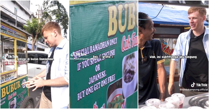 “Spesial hanya saat ramadan. Jika kamu berbicara bahasa Inggris atau bahasa Jepang beli satu gratis satu,” tulis keterangan pada spanduk di gerobak penjual.