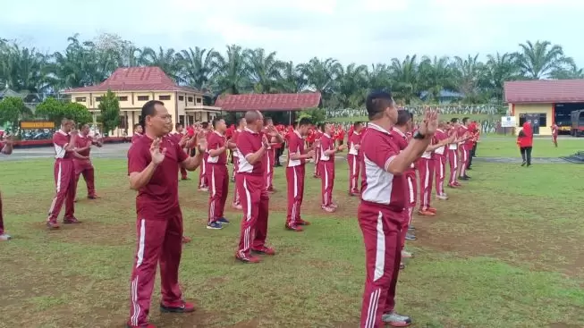 Seluruh personil Batalyon B Pelopor Brimob Polda Sumatera Selatan tampak semangat mengikuti setiap gerakan yang dipimpin oleh instruktur senam.